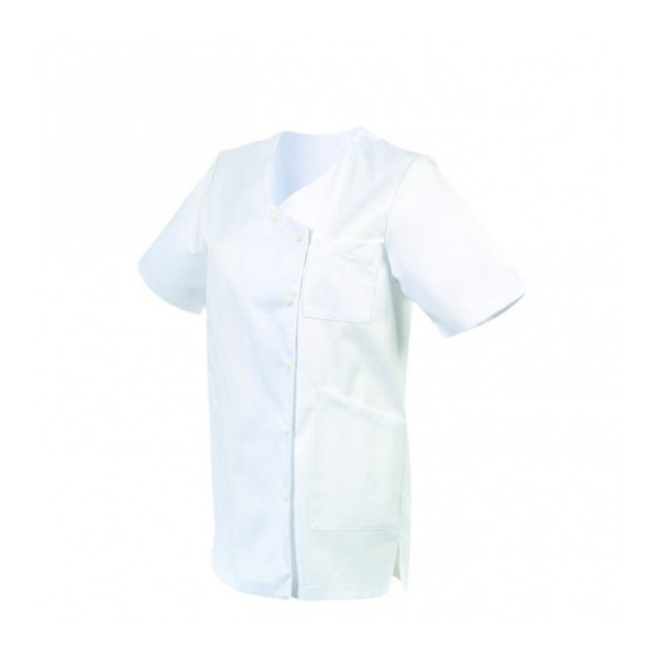 Tunique Robur modèle Passion pour femmes, encolure en V, manches courtes, 2 poches basses, 1 poche poitrine plaquée, longueur dos 72 cm, coloris blanc.