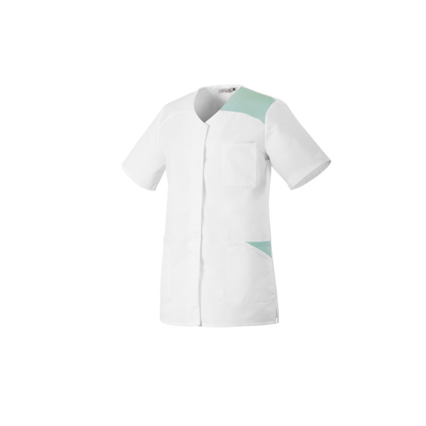 Tunique Robur modèle Flavie pour femmes, encolure en V, manches courtes, pressions cachées, empiècement épaule et brides contrastés, 2 poches basses plaquées avec empiècements contrastés, 1 poche poitrine plaquée, fentes côtés, longueur dos 75 cm, coloris blanc/vert.